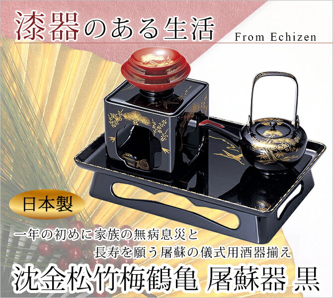 ギフト対応 商品名:沈金松竹梅鶴亀 屠蘇器 黒 1015202 旬なキーワード:屠蘇器 銚子 盃 盃台 盆 セット 木製 本堅地 日本製 越前漆器 うるし 艶 上品 定番 漆器 漆塗 手塗 高級 正月 屠蘇の儀式 おすすめ