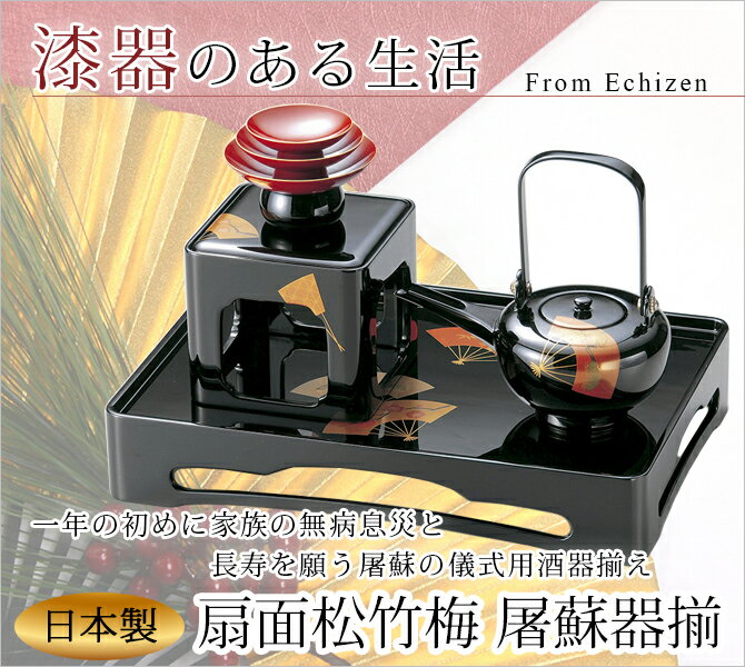 ギフト対応 商品名:扇面松竹梅 屠蘇器揃 1015302 旬なキーワード:屠蘇器 銚子 盃 盃台 盆 セット 木製 磨き 日本製 越前漆器 うるし 艶 上品 定番 漆器 漆塗 手塗 高級 正月 屠蘇の儀式 おすすめ