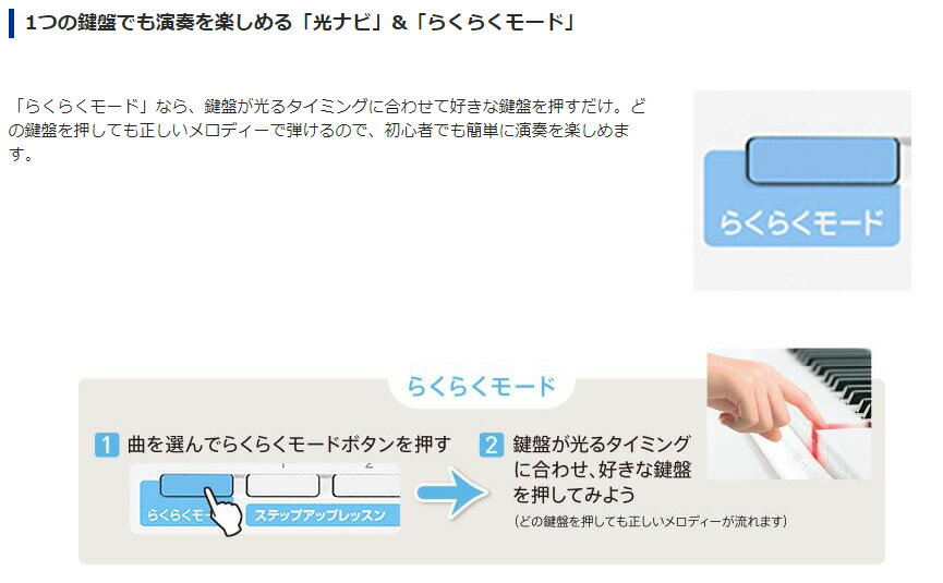 さらに、「らくらくモード」ならどの鍵盤を押しても正しいメロディーで弾けるので、 初心者でも簡単に演奏を楽しめます。