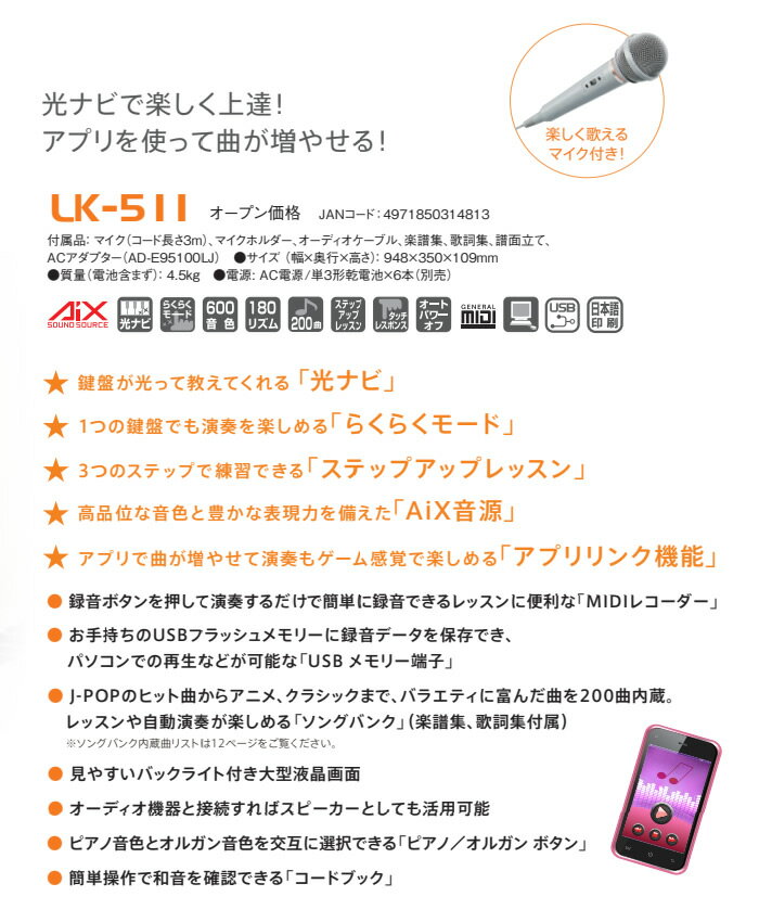 ■アプリで手軽に曲が増やせる!ゲーム感覚で楽しく弾ける! LK-511専用アプリ「ソングバンクプラス」(2018年9月公開予定) LK-511は、曲をダウンロード購入して収録曲を増やせるアプリ「ソングバンクプラス」に対応。